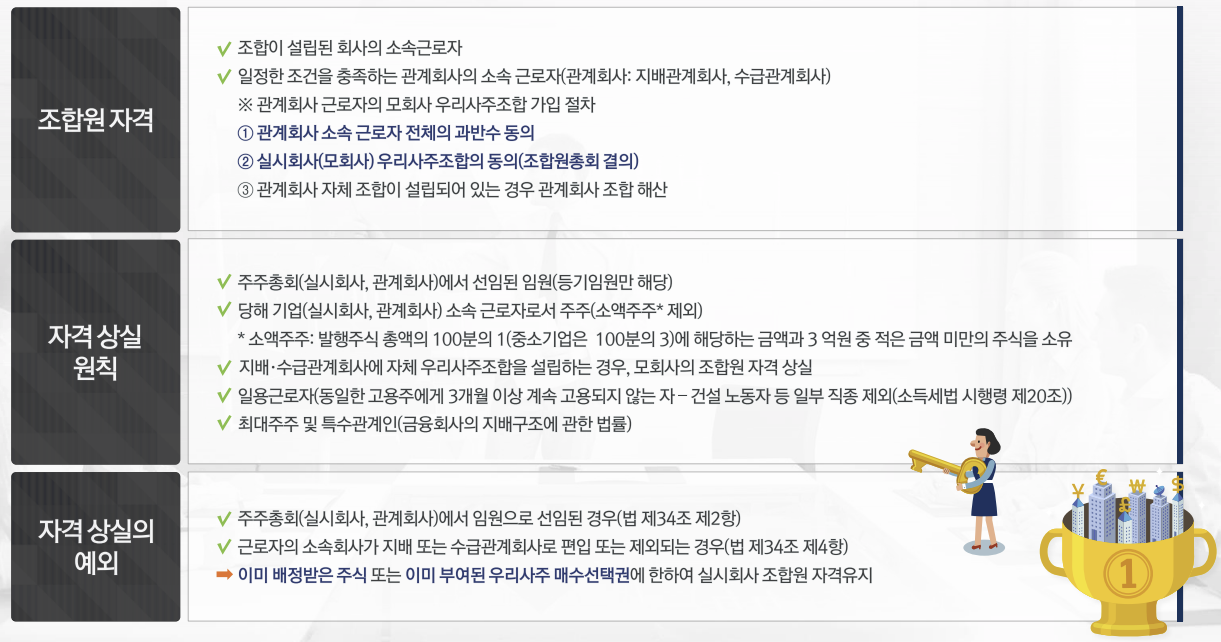 원칙적으로 모든 근로자는 자유로이 우리사주 조합에 가입하거나, 조합으로부터 탈퇴가 가능함. 즉, 근로자 의 우리사주조합 가입은 권리이지 의무가 아님